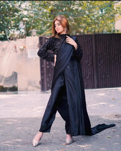 Stiched Pearls Embroidered Saree With Petticoat And Blouse (3 Colour)